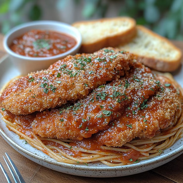- Add Sauce and Cheese: Preheat your oven to 375°F (190°C). Place the fried chicken on a baking tray, spoon marinara sauce over each piece, and top with mozzarella cheese. Bake until the cheese is melted and bubbly, about 10 minutes.